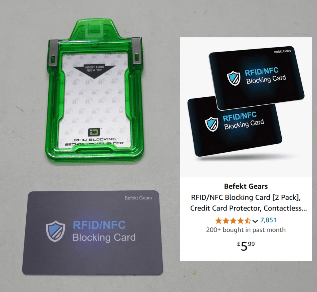 I bet you’ve seen these “RFID blockers” off Scamaz… Amazon and wonder if they work. In this photo are two types; a professional type designed to meet specific standards and the bottom one which is the Scama… Amazon special. Shove it in your wallet, purse, etc and it’ll apparently block card cloning / contactless transaction attacks.