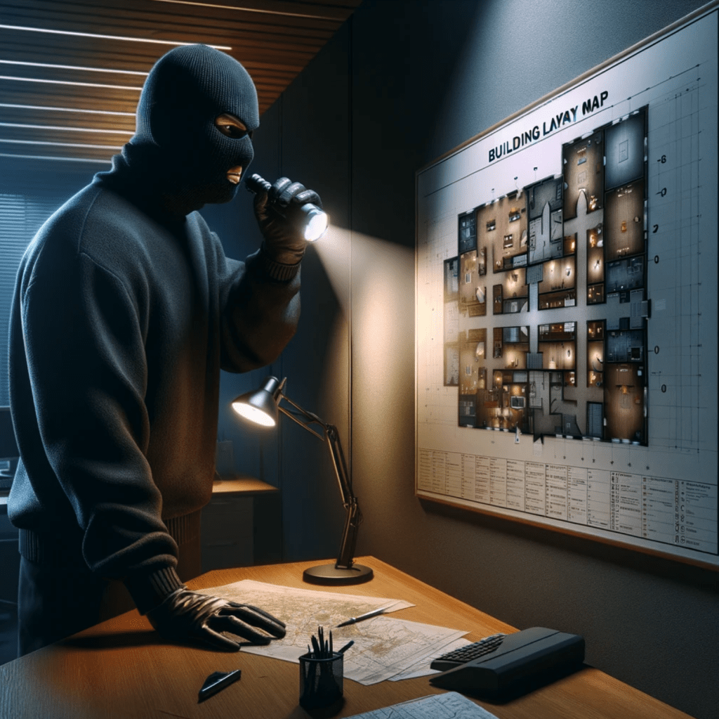 There are fire plans and maps around most large buildings. They’re on the walls and give a lovely overview of the place. The time they save a potential attacker is phenomenal.